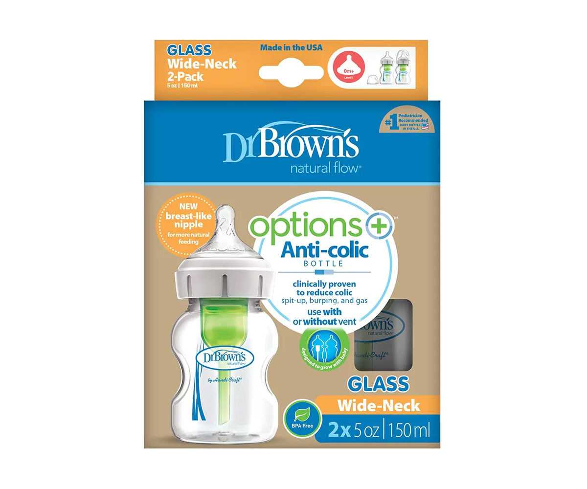 Choose Dr. Brown’s Options+ Glass Bottles for a safe, comfortable, and colic-free feeding experience—day or night.