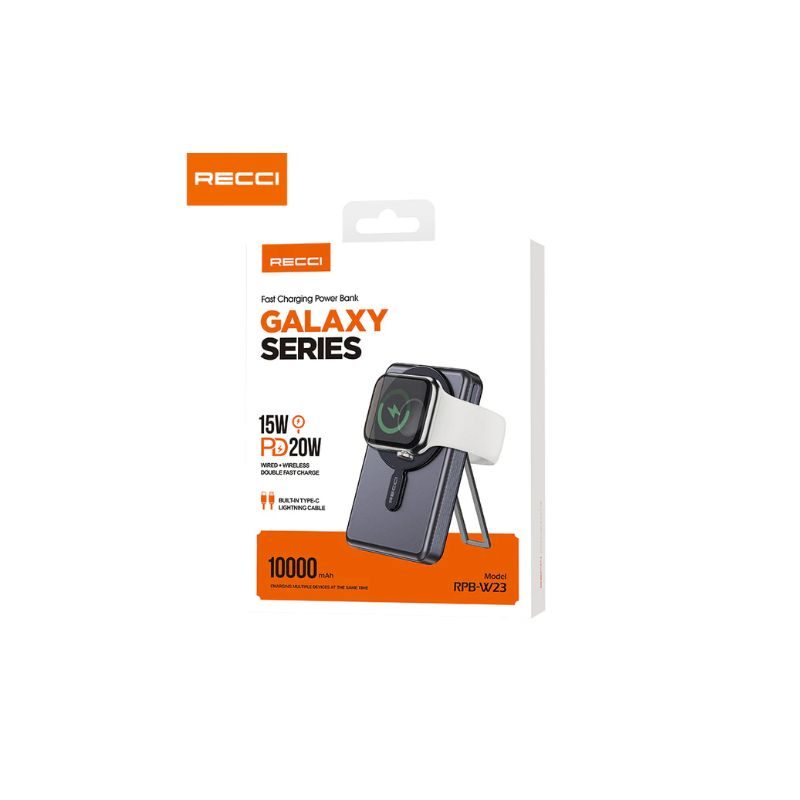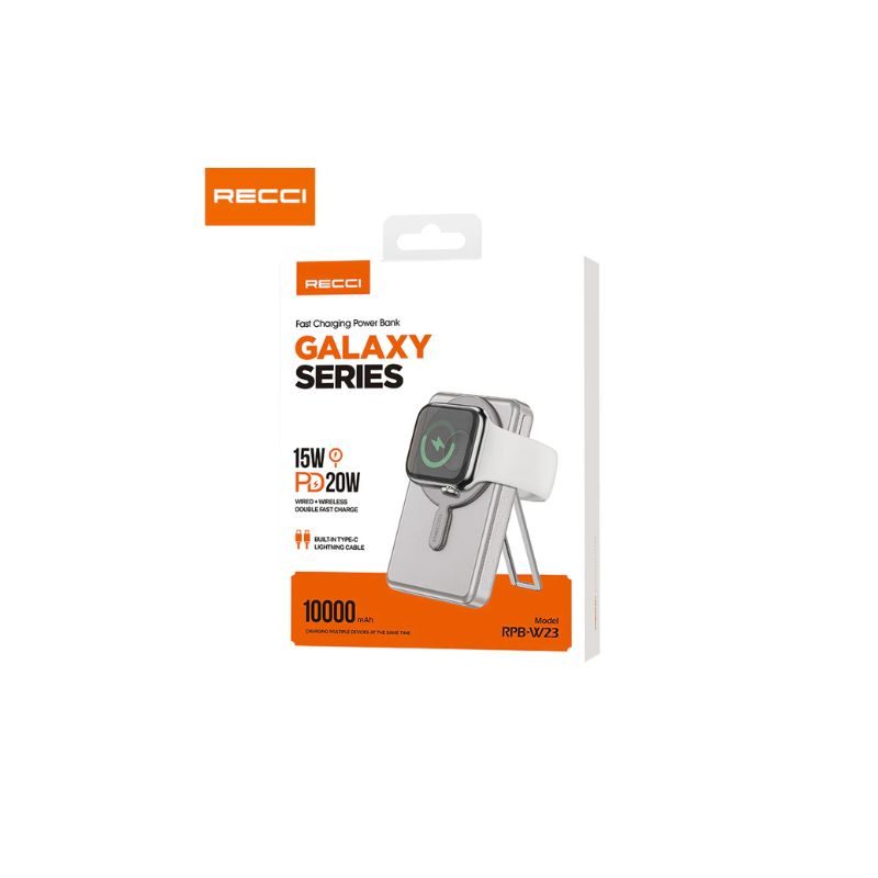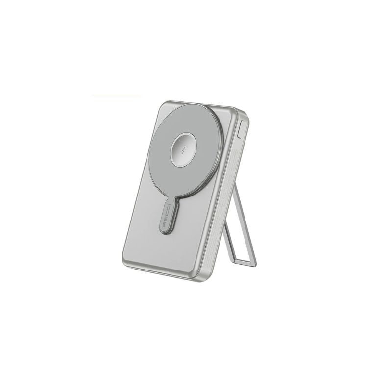 Recci RPB-W23 Wireless Magsafe Power Bank, the ultimate power solution for your devices. This is a sleek, high-capacity 10000mAh power bank designed to keep you charged on the go. Equipped with 20W wired fast charging and 15W wireless charging, it ensures rapid power delivery for your essentials. Plus, it supports wireless charging for Apple Watch, adding an extra layer of convenience. The built-in stand function offers hands-free usage, making it perfect for work or entertainment. Available in stylish gray and white, this power bank combines functionality and modern design effortlessly. Stay powered up anytime, anywhere!